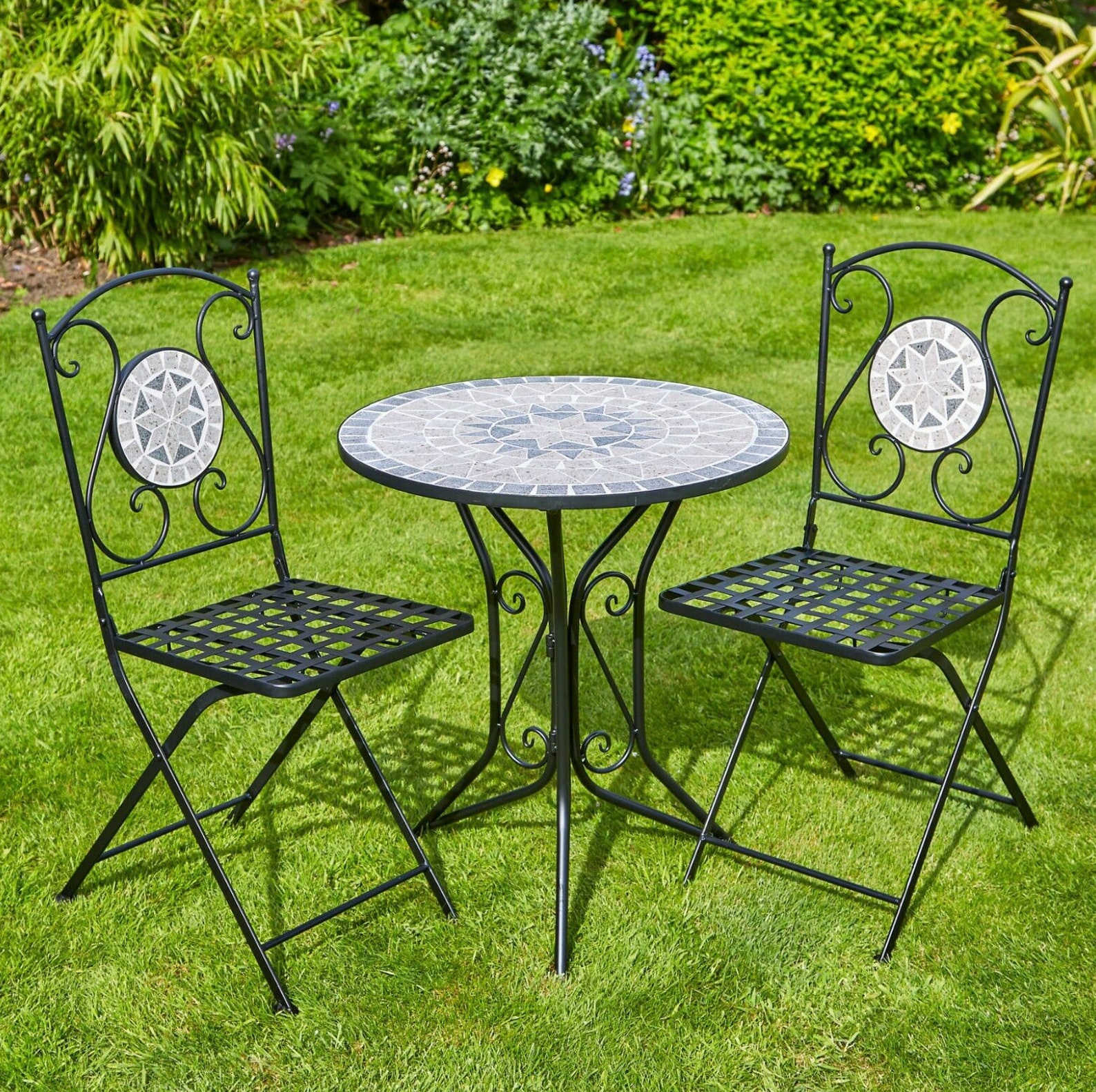 Bistro Set with Mosaic Tile $ 295.00 $ 147.50. Bistro Set with Mosaic Tile quantity. Add to cart. Category: Garden Décor. Description Description. Indoor/Outdoor 3-Piece Mosaic Bistro Set Folding Table and Chairs. 3-PIECE SET: Mosaic bistro set includes round table and 2 matching chairs, perfect for your backyard, patio, deck, or garden;