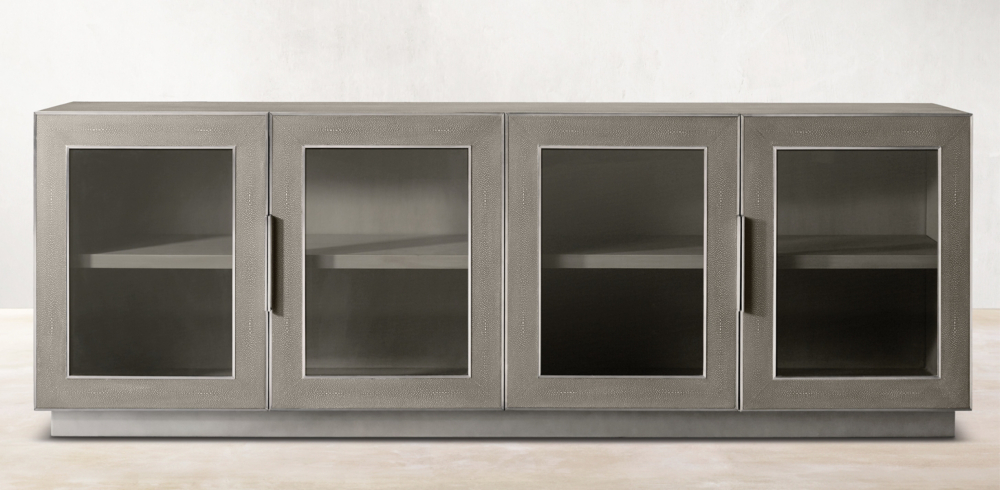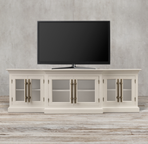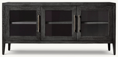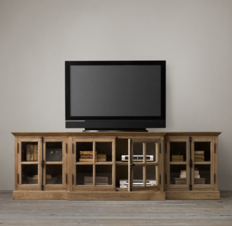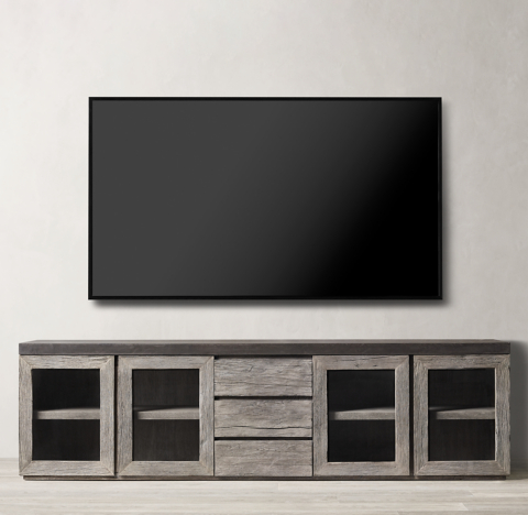 Restoration Hardware. View console in @can1love's Living Room. The Grand Framed Glass 4-door Media Console is crafted in a beautiful weathered gray or brown oak, giving it more of an aged look. It's clean lines and bold handles give it the perfect balance of a stand out statement piece. Candace's media console serves as the focal point of the ...