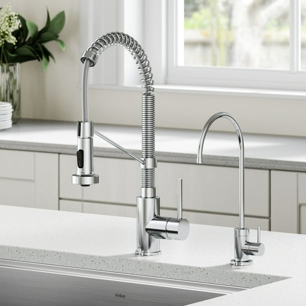 KRAUS Bolden Commercial Style Pull-Down Kitchen Faucet and Purita Water Filter Faucet Combo in Chrome