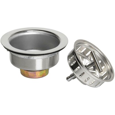 Details. Features: Durable stainless steel construction. Extra deep removable basket with finish-matching stopper. Use with any standard 3-1/2" kitchen sink drain hole openings. Slip in strainer includes metal handle for easy lift out. Fits all sinks up to 3/8" thick and is great if you don't have a disposer - after rinsing your dishes, you can ...