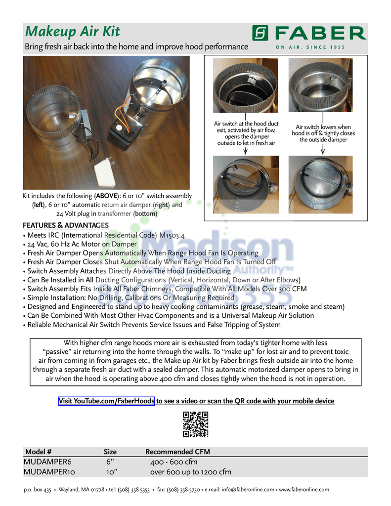Make-up Air Kit. Actual retail prices may vary by dealer. MSRP applies to the continental 48 United States and does not include such items as delivery, installation, installation accessories (i.e. range cords), or removal of old appliances. Make-up Air System. Our complete line of indoor and outdoor make-up air units gives you a broad range of options to meet your needs. Our duct furnaces can be ordered with several different options so they fit your specific requirements. Several options are also available for the outdoor and indirect indoor make-up air unit. Makeup air is outside air that replaces air exhausted from inside the building. In most houses, there are several appliances that push or pull air out of the house, including clothes dryers, bathroom fans, fireplaces and kitchen range hoods. When even one of those appliances is operating, it depressurizes the interior. Nature abhors a vacuum, so to restore the pressure balance, outside air is ... Makeup Air Systems consist of a make-up air damper, mounted on the return air duct of an HVAC system, and an intake air hood, installed through an exterior wall, to allow outdoor air into the home, with the two being typically connected by installer-supplied standard 6″ galvanized sheet-metal pipe. Functions with or without the HHSC+ control.