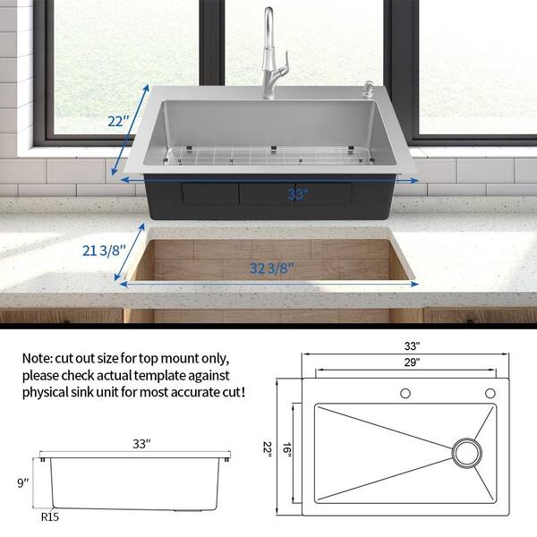 Locating a suitable 33x22" kitchen sink based on cutout size. Any resources or sites to use for an efficient way to find specs and sort by cutout size? --- Details --- Kitchen sink faucet replacement morphed into replacing the garbage disposal and, ta-da, kitchen sink. Hardware store plumber c... Mar 02, 2020 · The standard sink size and dimensions are about 22 inches long to 30-33 inches wide. Sink dimensions can vary from 9inches in length up to 40 inches for oversized sinks. Single bowl sinks will run on average up to 30 inches in length. Single bowl sinks are typically the standard sinks places in homes. Standard double bowl kitchen sink sizes are ... 2. Flip the sink upside down on the counter so it covers the old sink cutout. Leave at least 2 inches in front of the sink. Most sinks have the same measurement front to back; use the original ... Kitchen Sink. Model(s) LWDB332284 ... Sink. Sink is manufactured from 20 gauge 300 series Stainless Steel ... Cutout Dimensions for Top Mount Installation:.