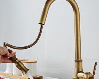 Paired with a single handle, this kitchen faucet offers effortless and precise control over the water temperature and volume. - Constructed from solid brass for durability and reliability. - Finished in high quality, corrosion-resistant antique brass. - Features a 360-degree swirling pre-rinse spout design. Antique Brass Faucet Kitchen Cold and Hot Water Deck Mounted Basin Retro Faucet Dual Handle Single Hole Rotatable Water Tap Kitchen. Delta Faucet Trinsic Gold Kitchen Faucet, Kitchen Faucets with Pull Down Sprayer, Kitchen Sink Faucet, Gold Faucet for Solid brass is by far one of the most durable and the most frequently used material for kitchen faucets. Along with many years of exceptional performance, they are less likely...