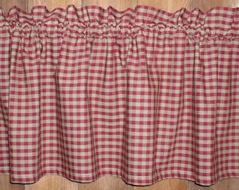 Farmhouse Check Gingham Red and White Swag Valance Curtain Lined 80" wide by 22" Long 12" long in the middle 2 " Rod Pocket 1 1/2" Header (Fabric above Rod Pocket) 1/4 Check Fabric One Piece Lined in White This swag is made after it is ordered. If you need an different rod pocket please let me