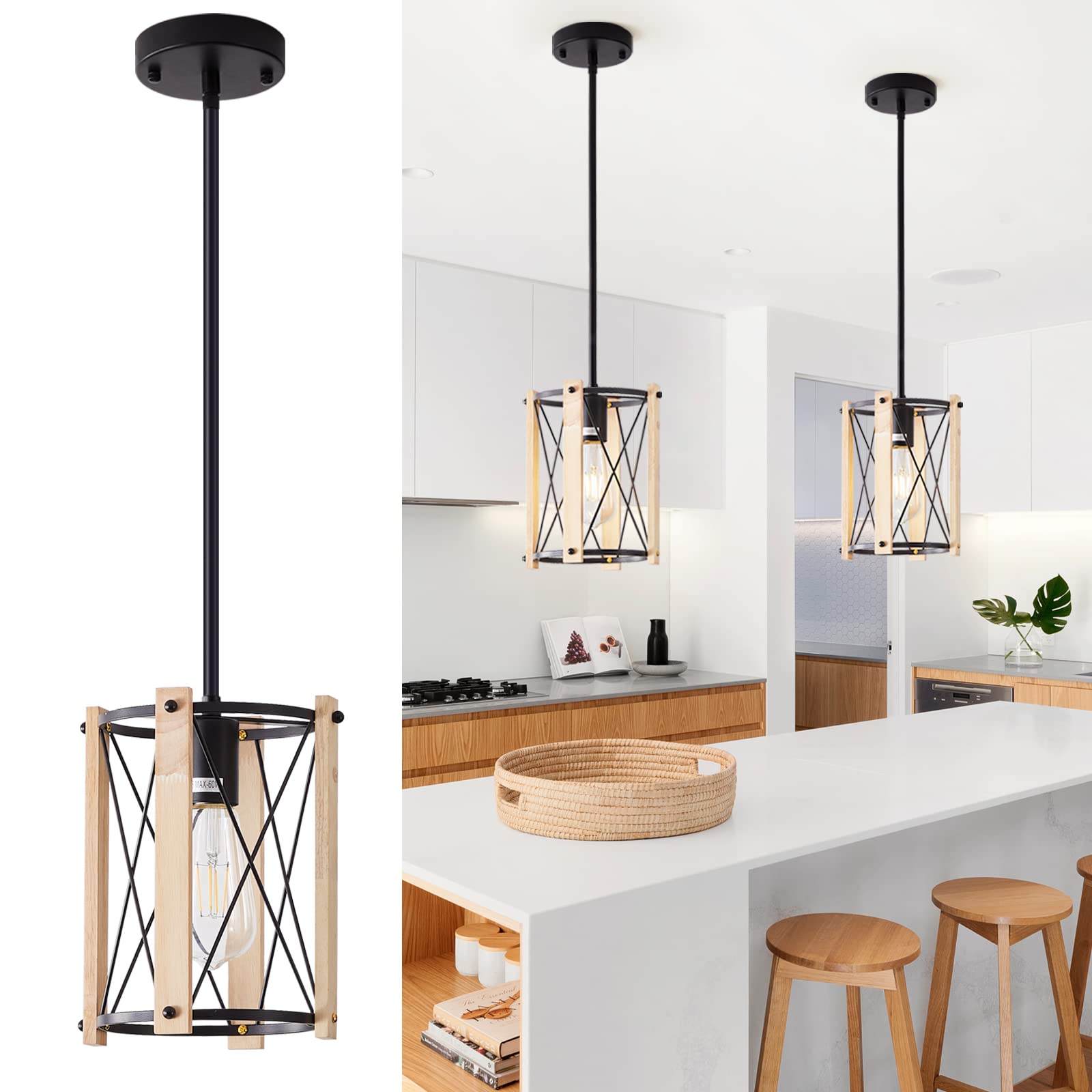Black Pendant Light for Kitchen Island, Farmhouse Pendant Light Small Pendant Lighting Fixtures with Wood for Dining Hall, Bedroom