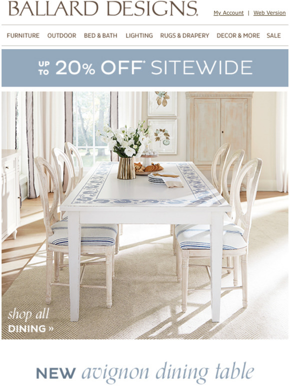 Ballard Designs Promo Codes - 40% OFF in December 2022 - CNN Check out the Ballard Designs outlet If you're lucky, there may be a local Ballard Designs outlet near you. Here, you'll find additional savings and deals on your favorite furniture, decor, and...