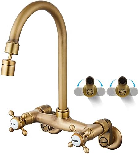 Antique Brass Wall Mount Kitchen Sink Faucet 6 Inch Center Adjustable Hole Distance with Swing Arms adpater Mixer Tap 360 Degree Swivel Spout Double ...