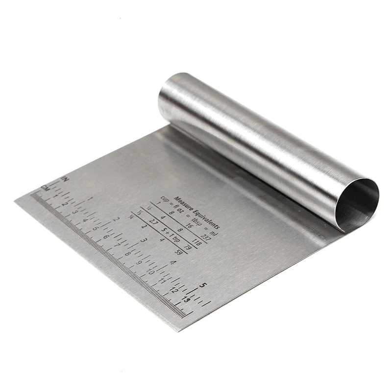 Stainless Steel Pasty Cutters Noodle Cake Scraper with Scale Dough Scra ... Suitable for dough and pizza scraper. A professional dough scraper tool with scale and more convenient to use. 1 x Stainless Steel Baking Pastry Spatulas. Stainless steel blade,easy to use and clean. Material: Food Grade Stainless Steel.