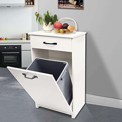 JPHMN Double Tilt Out Trash Cabinets Kitchen Wooden Dog Proof Trash Can Cabinet Free Standing Waste Can Bin Holder Recycling Cabinet with 2 Drawers, ...